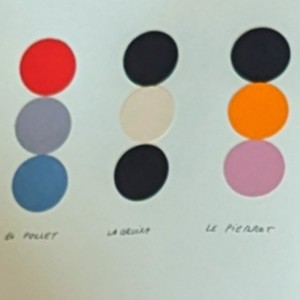 L'artista ha plantejat un cartell com un joc. A partir de la combinació de tamanys i colors de cercles, hi podem cercar i trobar cadascuna de les figures i comparses. Les podem reconèixer pels colors que li són característics, tant de la figura com de la vestimenta dels portadors i portadores.